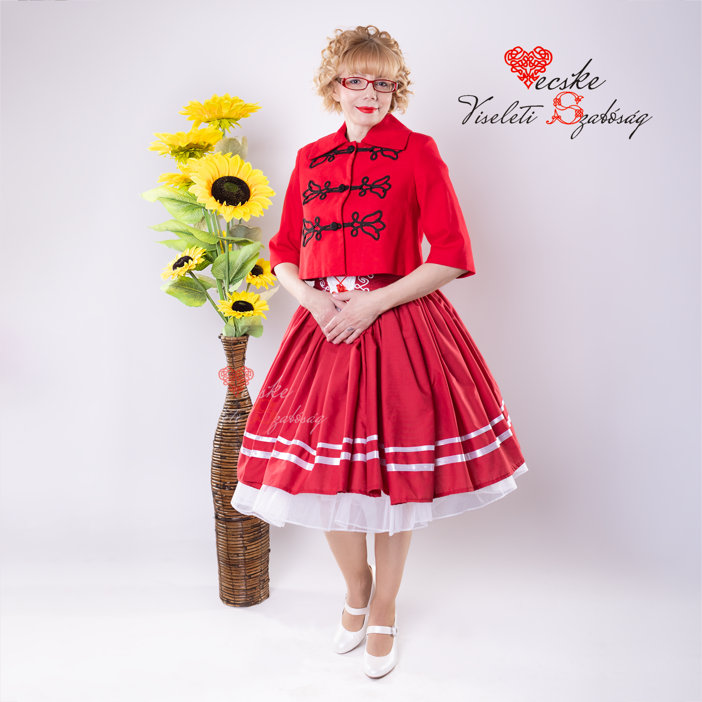 Piros női kabát fekete Bocskai zsinórral